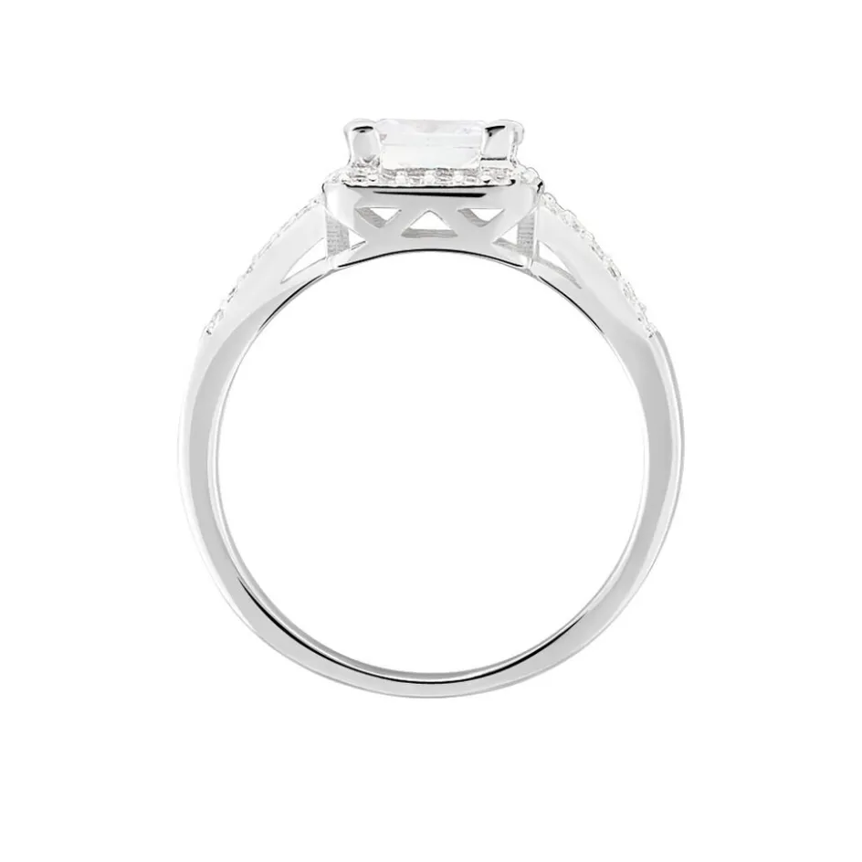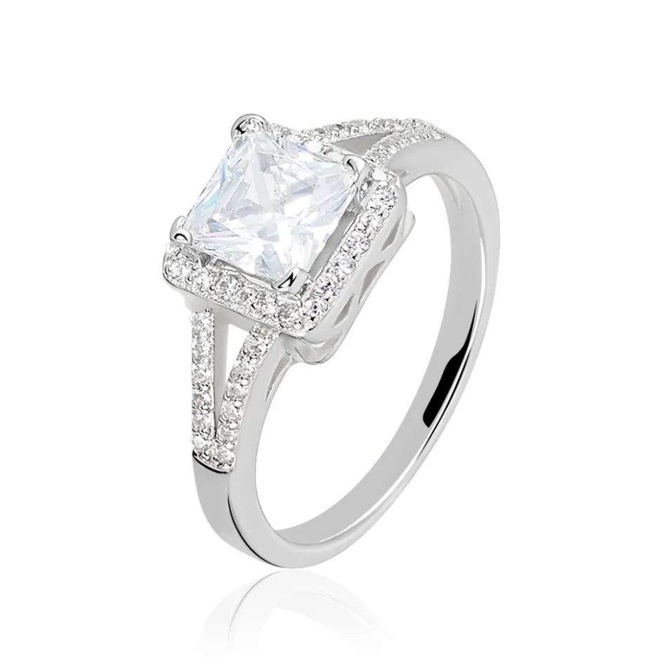Solitaire Bague Argent Blanc 925/1000 Oxyde De Zirconium Carre Central Accompagne Entourage Oxydes De Zirconium