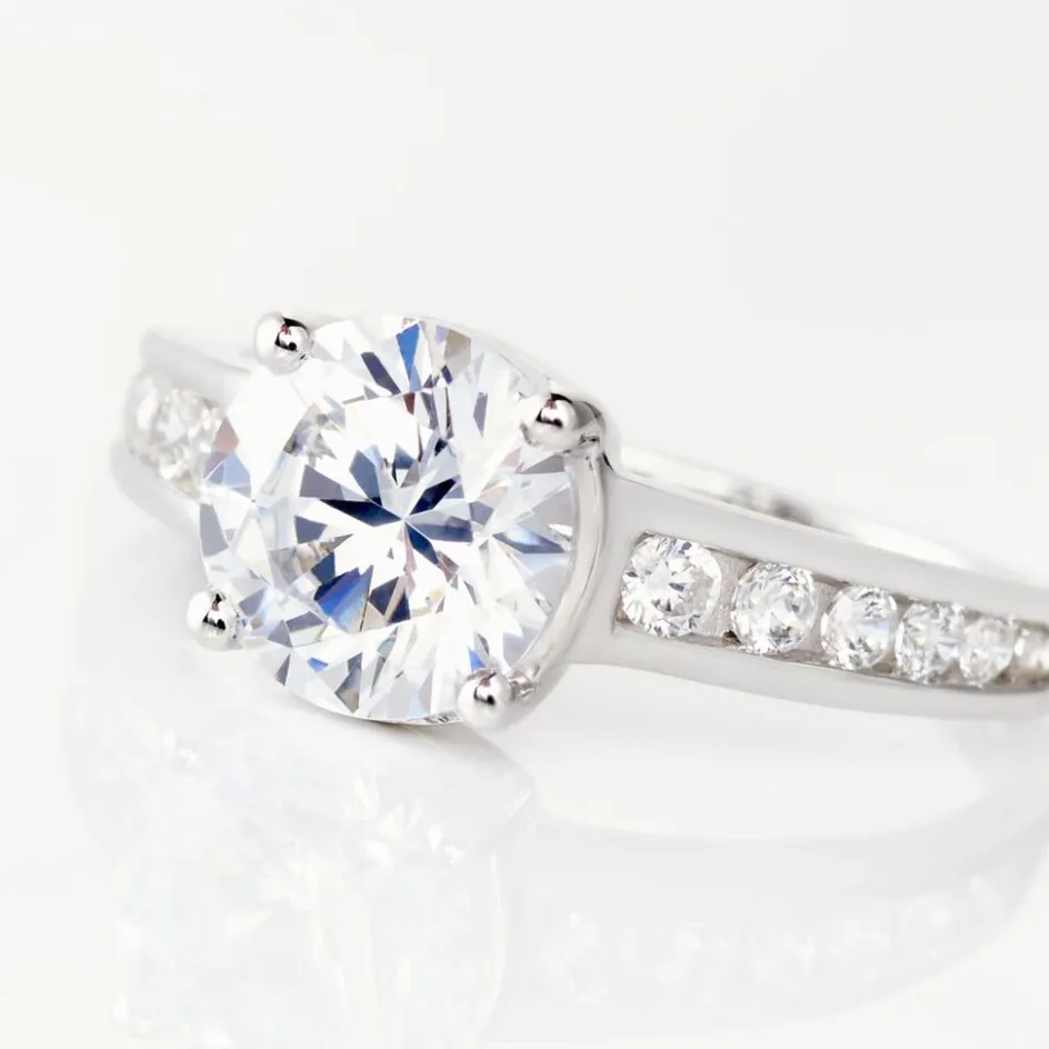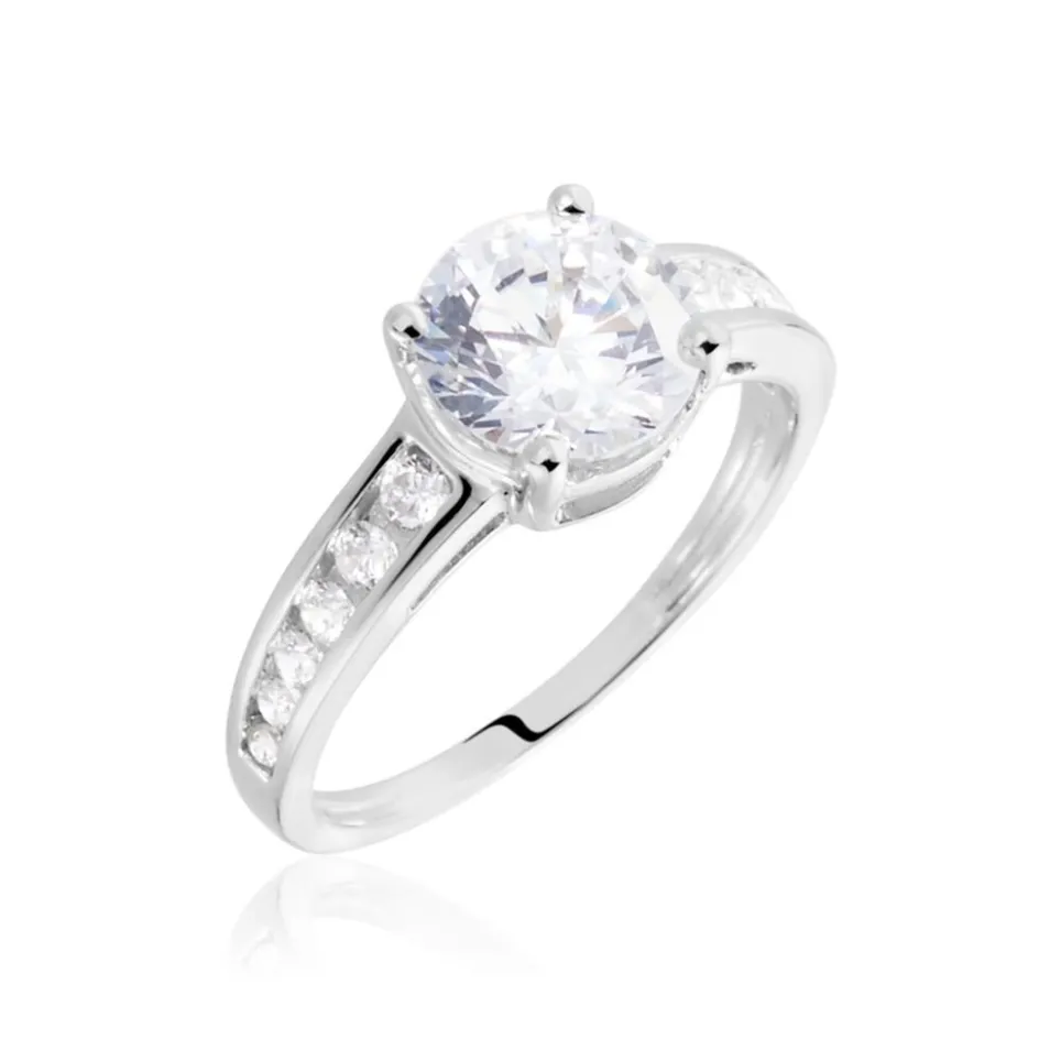 Solitaire Or Blanc 375/1000 4 Griffes Corps De Bague Accompagne Oxydes De Zirconium Serti Rail