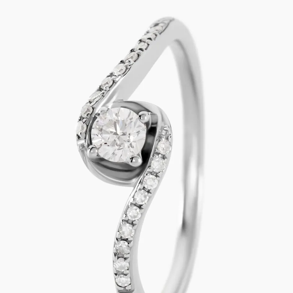 Bague Or Blanc 375/1000 Diamant 0.1cts Central Accompagne Diamants Effet Vrille Mm