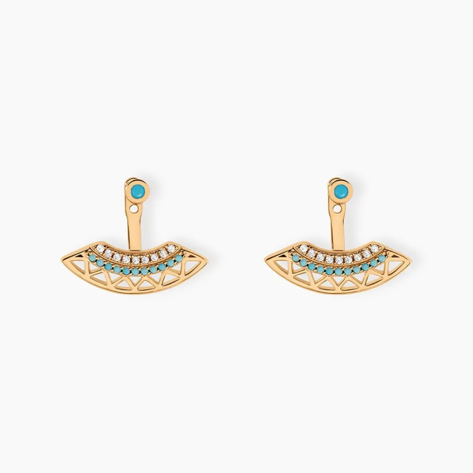 Bijoux D’oreilles Plaqué Or Jaune Motifs Mexicains Ajoures Oxydes De Zirconium Et Pierres Bleues