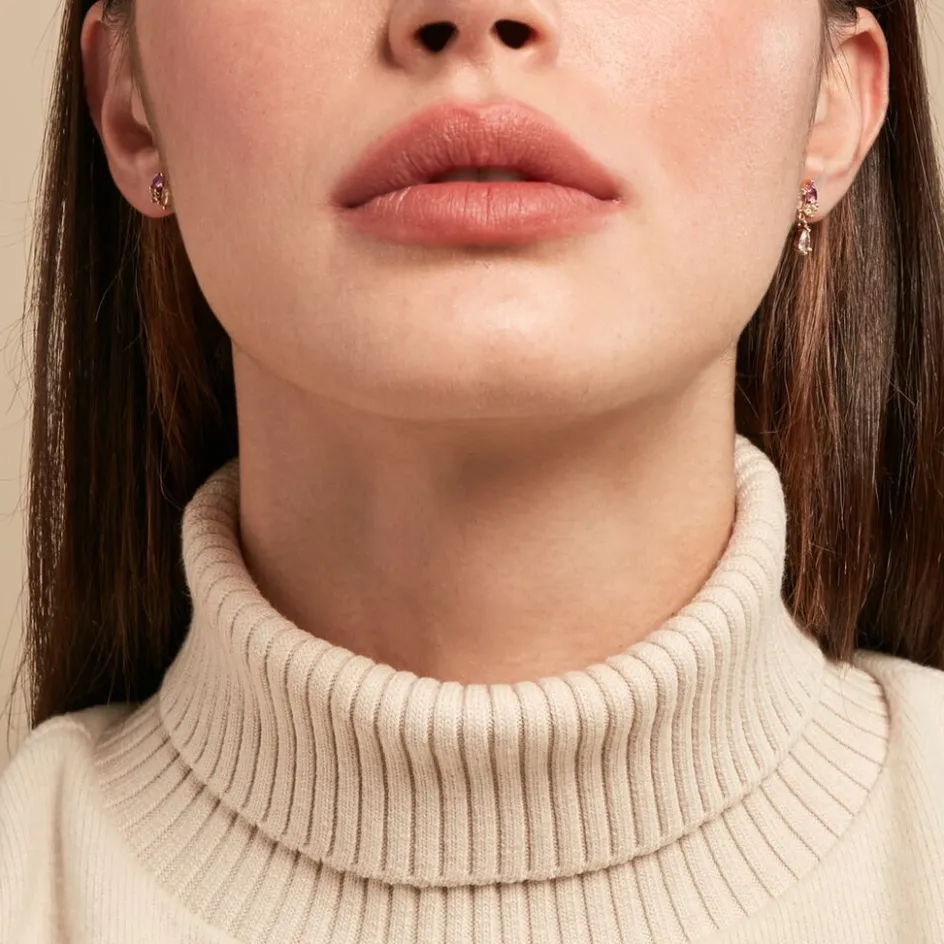 Boucles D’oreilles Pendantes Plaqué Or Jaune Asymetriques Jardins De Pierres Spinelles Fuschia Et Oxydes De Zirconium Multicolores
