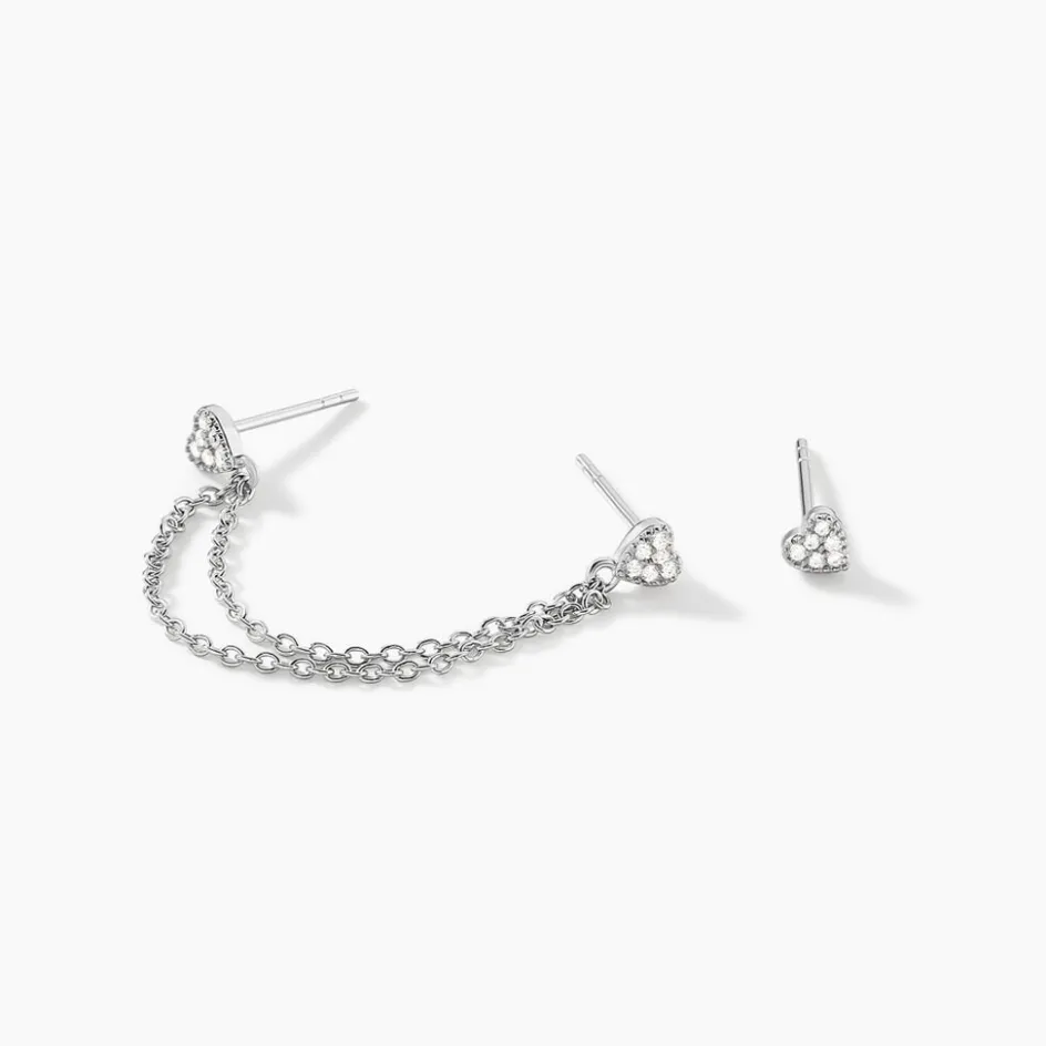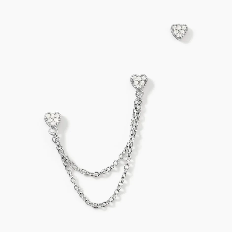 Boucles D’oreilles Dépareillées Ou 3 Trous Argent Blanc 925/1000 Coeurs Oxydes De Zirconium Double Chaîne Forçat