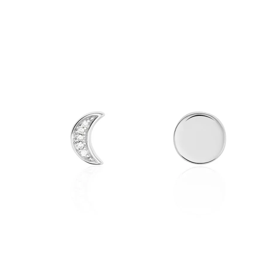 Boucles D’oreilles Puces Argent Blanc 925/1000 Formes Pastille Et Lune Pavee Oxydes De Zirconium