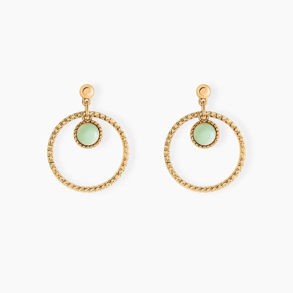 Boucles D’oreilles Pendantes Plaqué Or Cercles Effet Perlé Aventurines Rondes