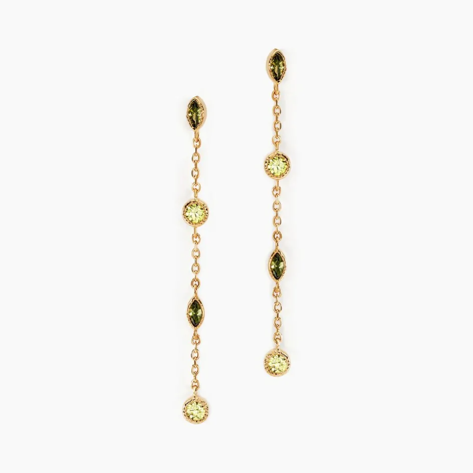 Boucles D’oreilles Pendantes Plaque Or Jaune Oxydes De Zirconium Verts Navettes Et Ronds Serti Clos