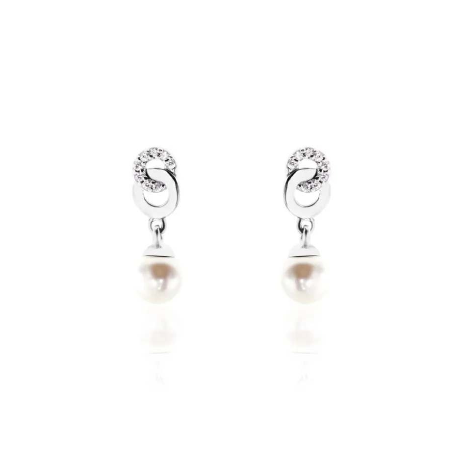Boucles D’oreilles Argent 925/1000 2 Anneaux Entrelaces Oxydes De Zirconium Et Perle De Culture 5.5mm