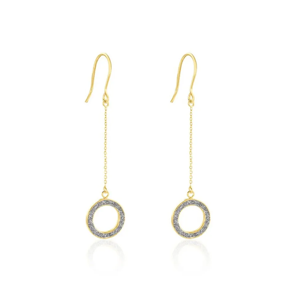Boucles D’oreilles Pendantes Or Jaune 375/1000 Cercles Ajoures Glitter Argente Chaine Maille Jaseron