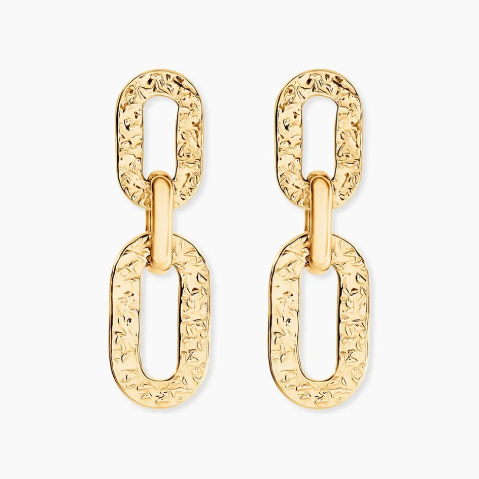 Boucles D’Oreilles Pendantes Or Jaune 375/1000 Maillons Rectangles Effet Martele
