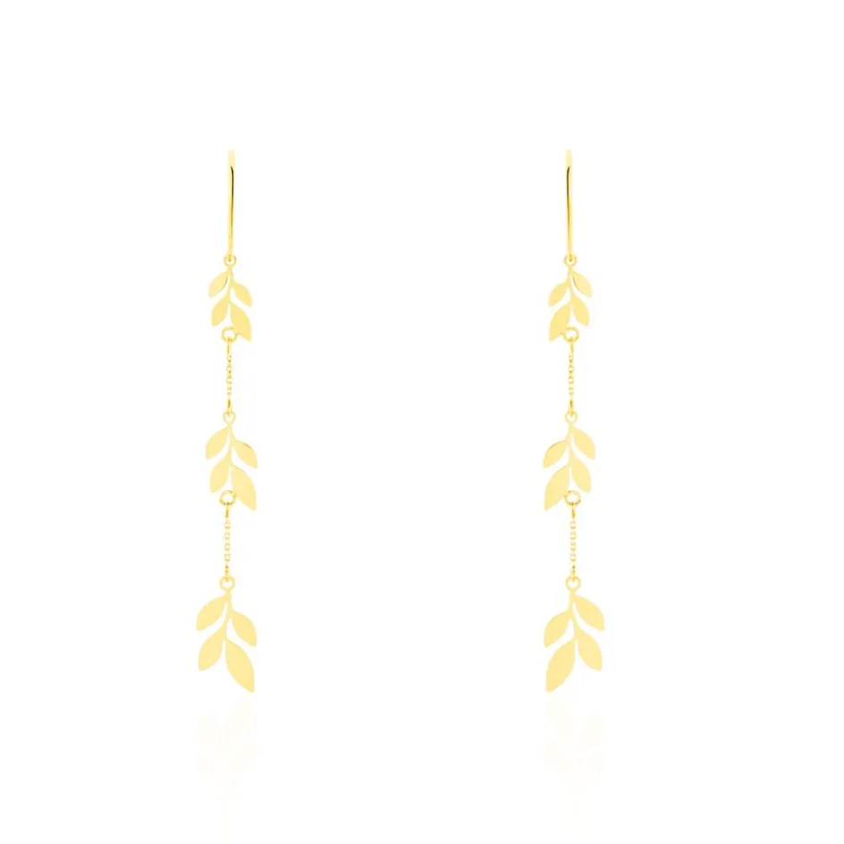 Boucles D’oreilles Or Jaune 375/1000 Pendantes Motif Feuille Chaine Maille Jaseron