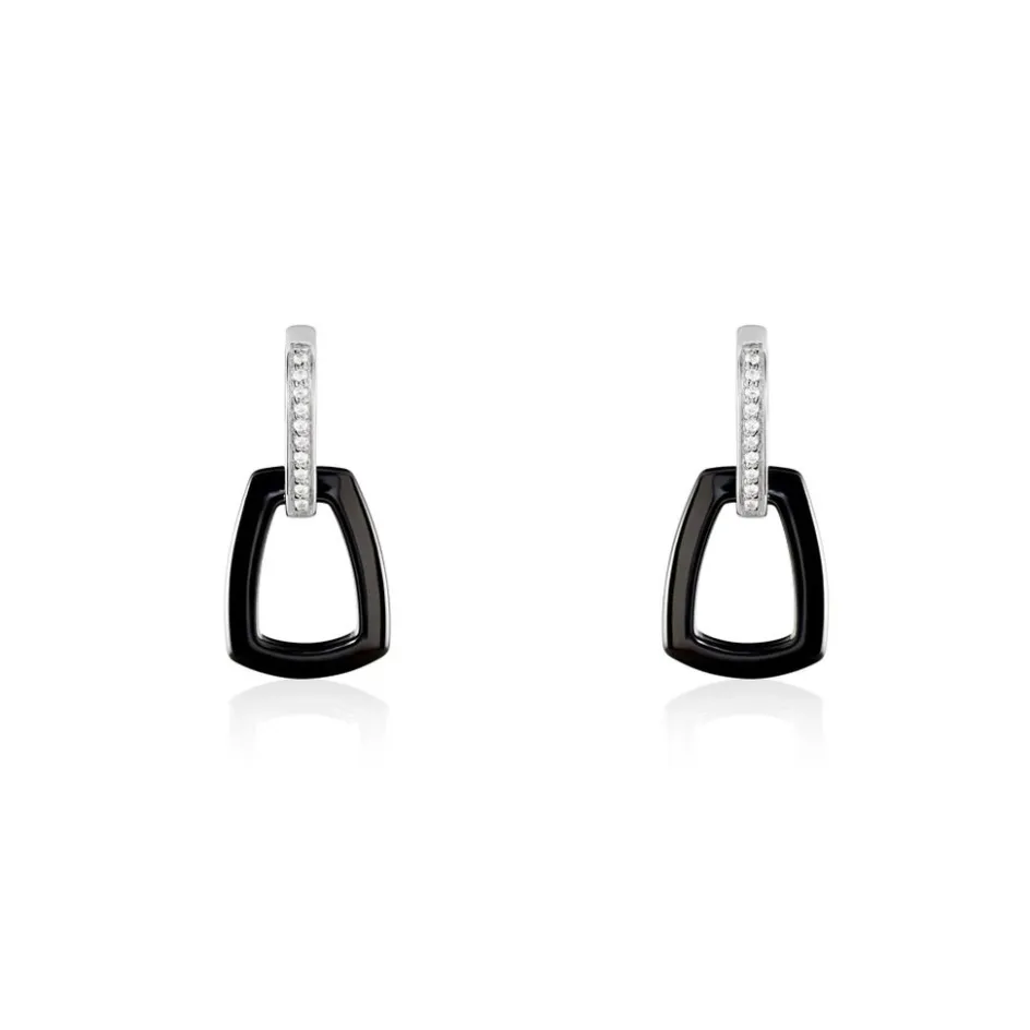 Boucles D’oreilles Pendantes Argent Blanc 925/1000 Motifs Ceramique Forme Etrier Tiges Oxyde De Zirconium