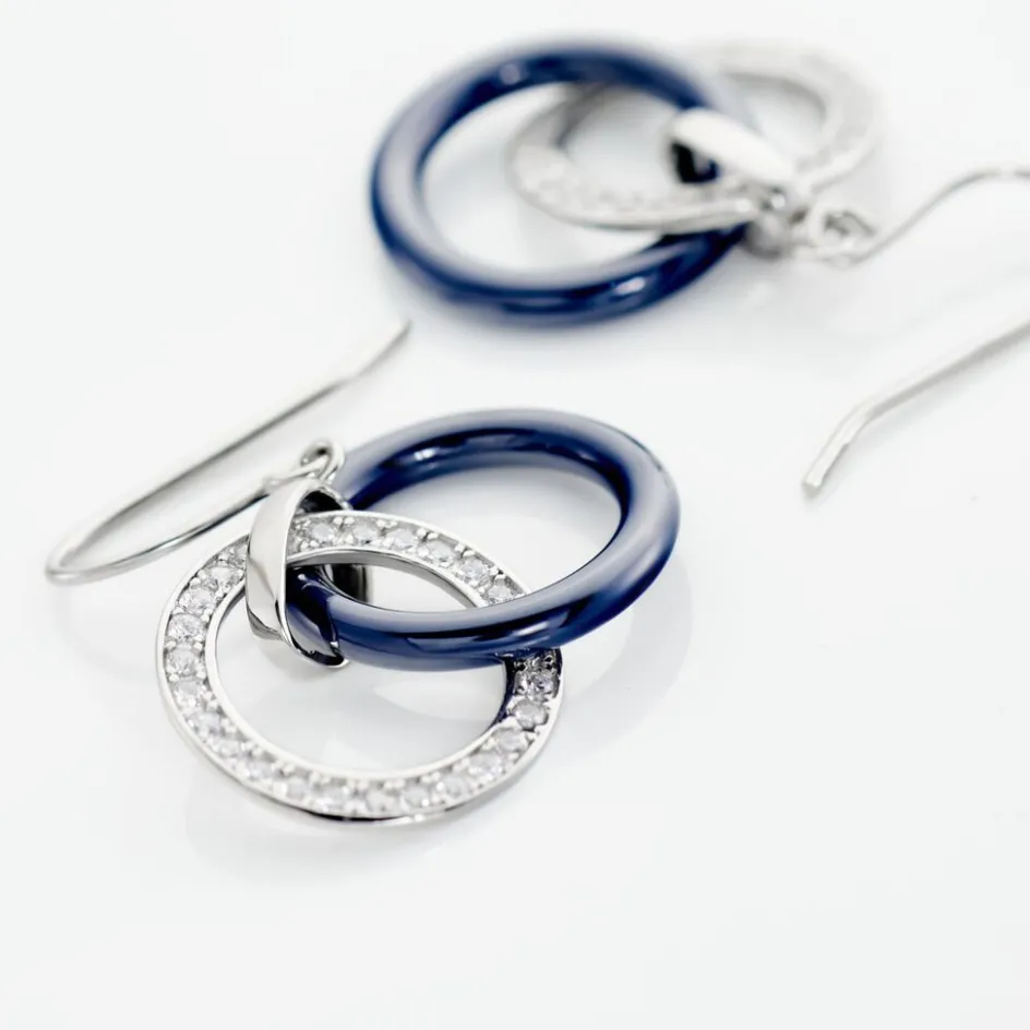 Boucles D’oreilles Pendantes Argent Blanc 925/1000 Cercles Entrelaces Ceramique Bleue Oxydes Micro Serti