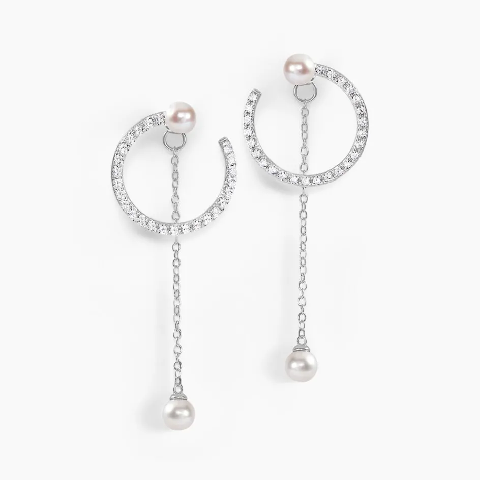 Boucles D’oreilles Pendantes Argent Blanc 925/1000 Perles Blanches Pavage Oxydes De Zirconium Fermoirs Chaînes Forçat Perle Pendante