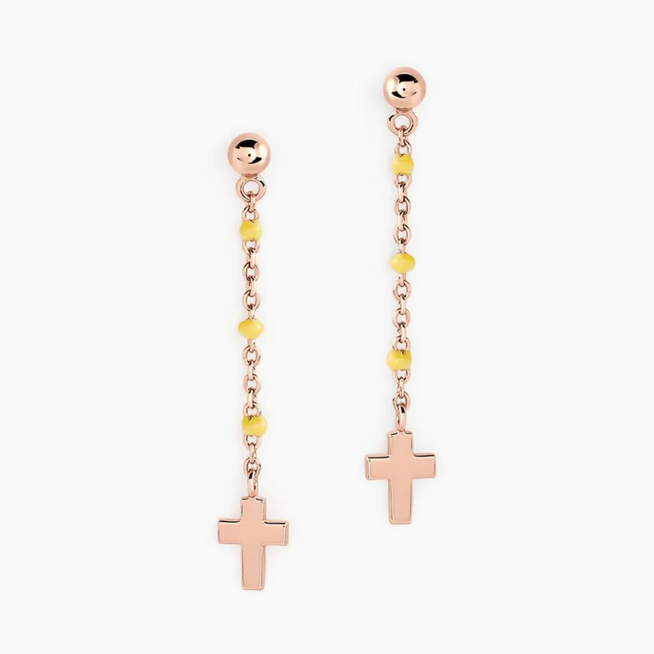 Boucles D’oreilles Pendantes Argent Rose 925/1000 Croix Boules émail Jaune Chaîne Jaseron 2cm