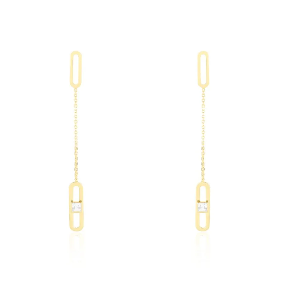 Boucles D’oreilles Pendantes Or Jaune 375/1000 Rectangle Oxyde De Zirconium Blanc Serti Clos