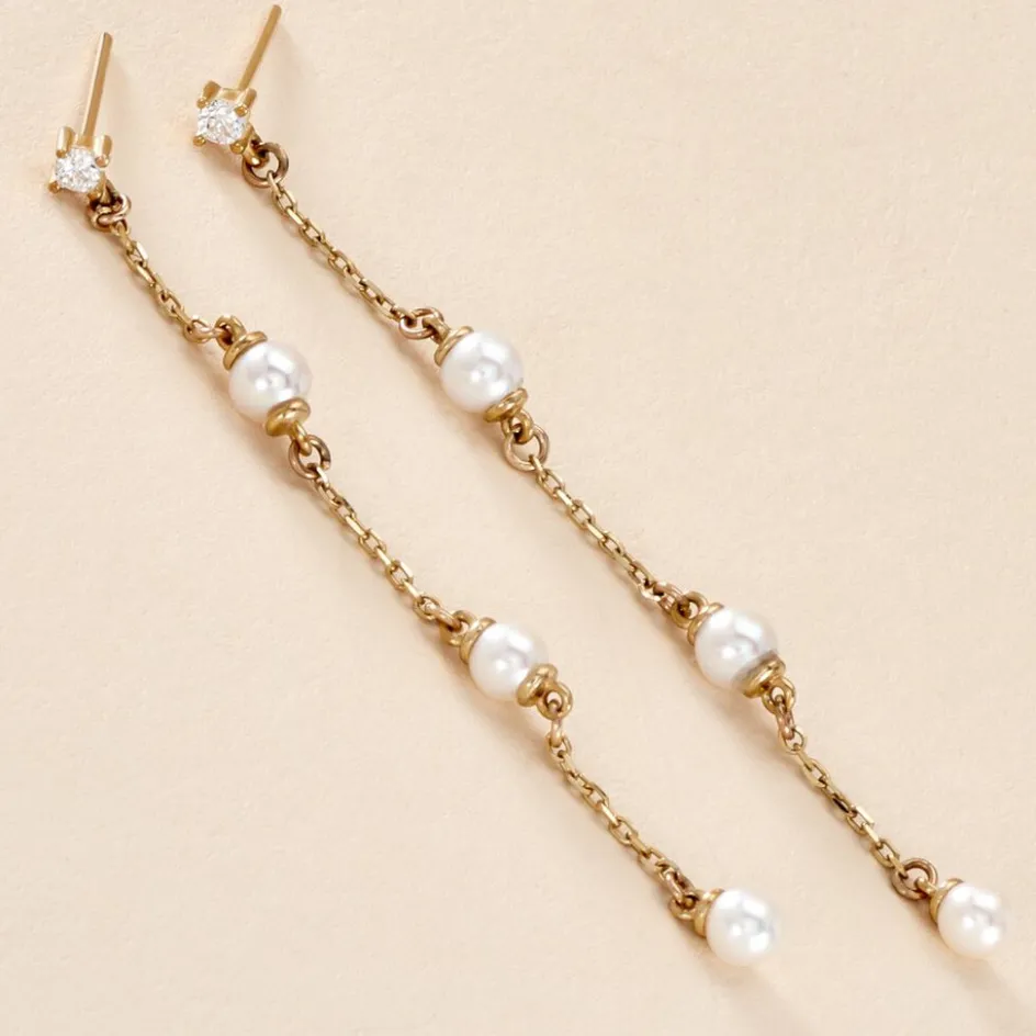 Boucles D’oreilles Pendantes Chaine Or Jaune 375/1000 3 Perles De Culture Nacre Blanche Accompagne Oxyde