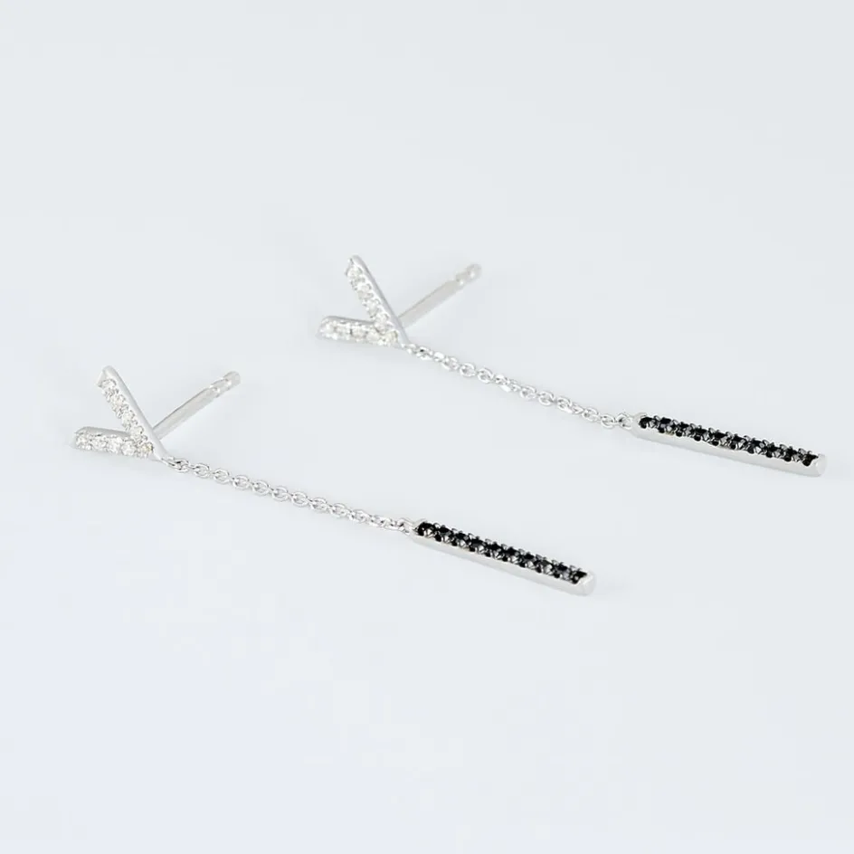 Boucles D’oreilles Or Blanc 375/1000 Formes V Pendantes Diamants Noirs Et Diamants Blancs