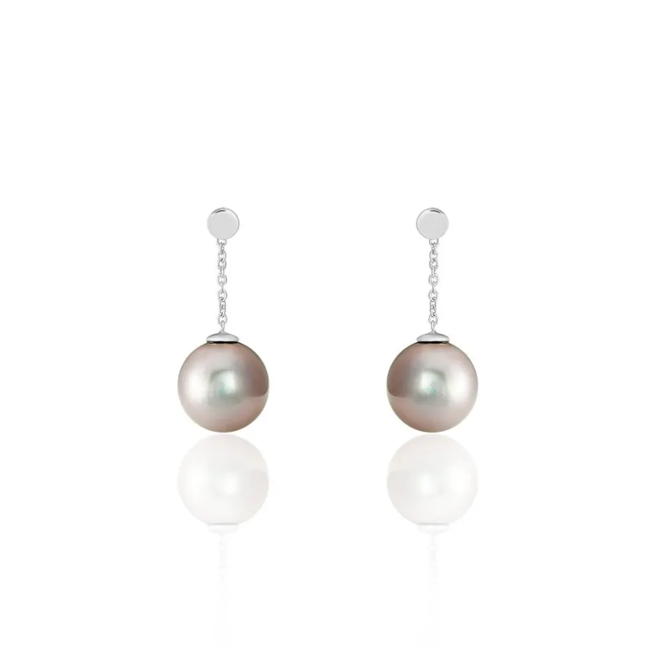 Boucles D’oreilles Or Blanc 375/1000 Perle De Culture Mers Du Sud Tahiti 8/9mm Semi-ronde