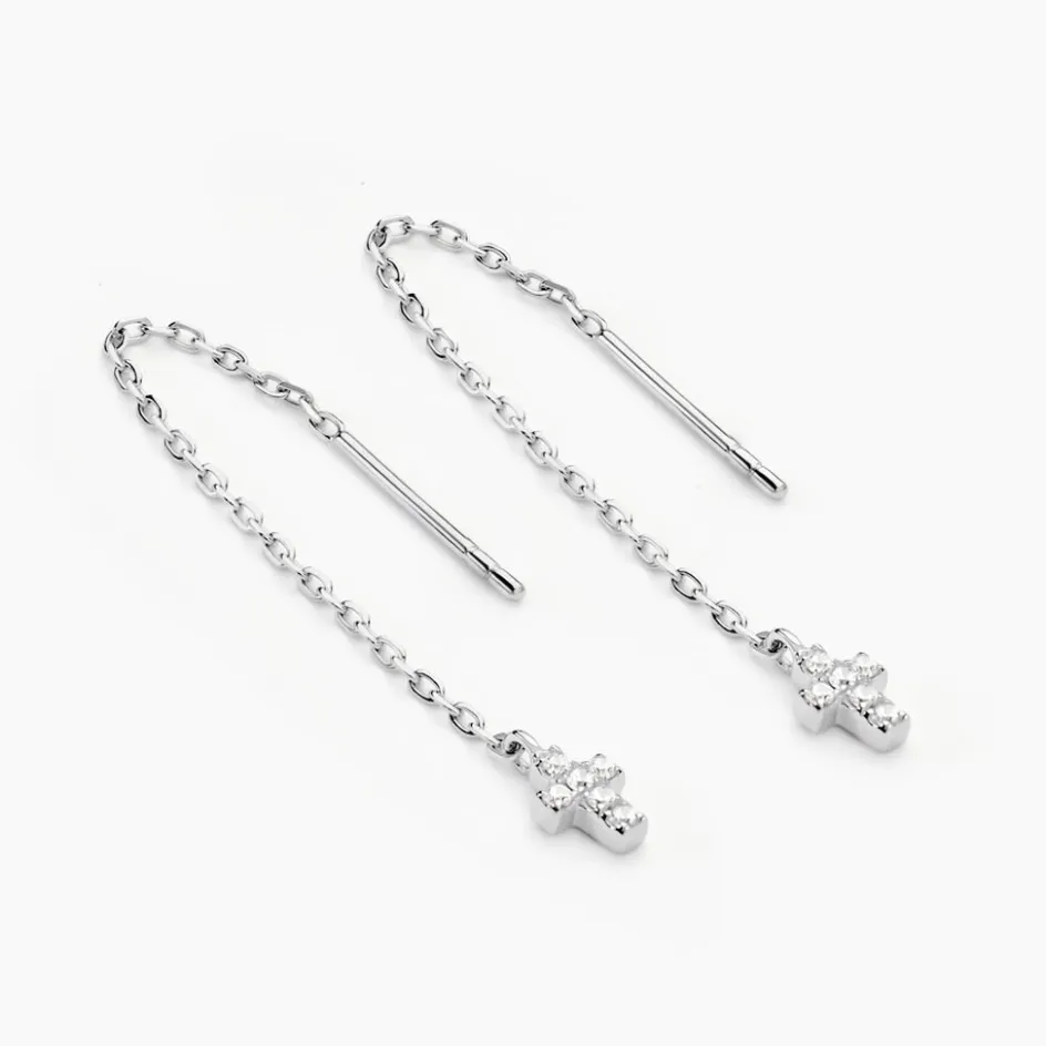 Boucles D’oreilles Argent Blanc 925/1000 Croix Oxydes De Zirconium Micro Serti Double Pendante Chaîne Forçat 4cm