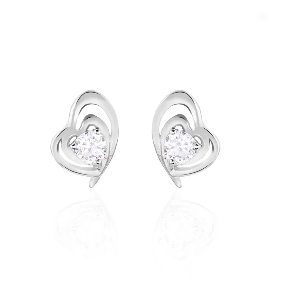 Boucles D’oreilles Puces Argent Blanc 925/1000 Coeurs Avec Oxyde De Zirconium