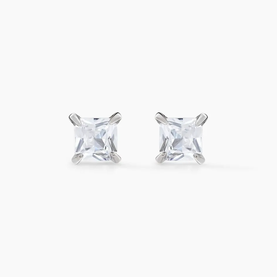 Boucles D’oreilles Puces Argent Blanc 925/1000 Oxyde De Zirconium Carré Serti 4 Griffes 4mm