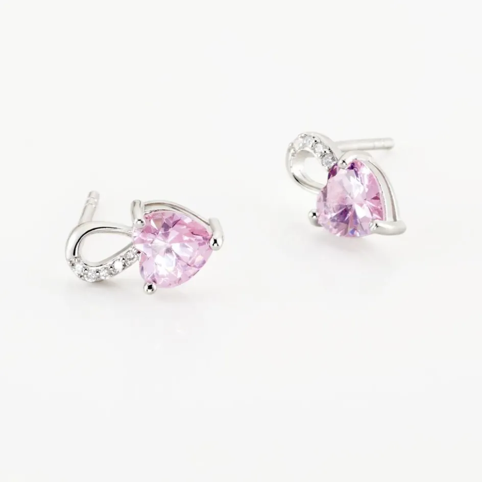 Boucles D’oreilles Puces Argent Blanc 925/1000 Coeur Rose Serti Griffes Accompagne Oxydes De Zirconium