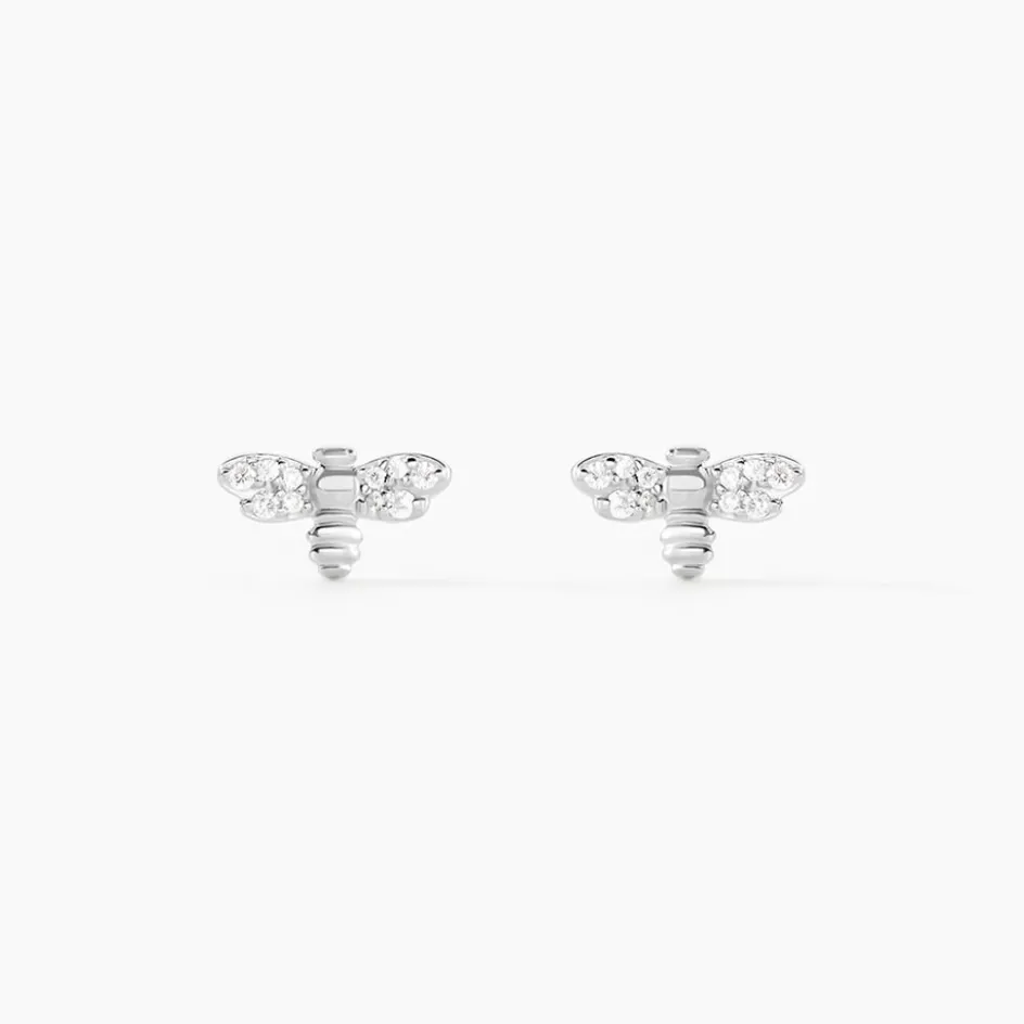 Boucles D’oreilles Puces Argent Blanc 925/1000 Abeilles Pavage Oxydes De Zirconium