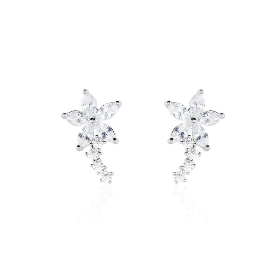 Boucles D’oreilles Puces Argent Blanc 925/1000 Fleurs Sertis Griffes Oxydes De Zirconium Navettes