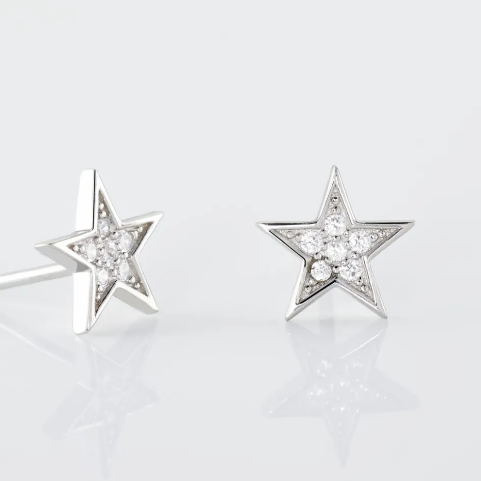 Boucles D’oreilles Puces Argent Blanc 925/1000 Etoiles Pavage Oxydes De Zirconium