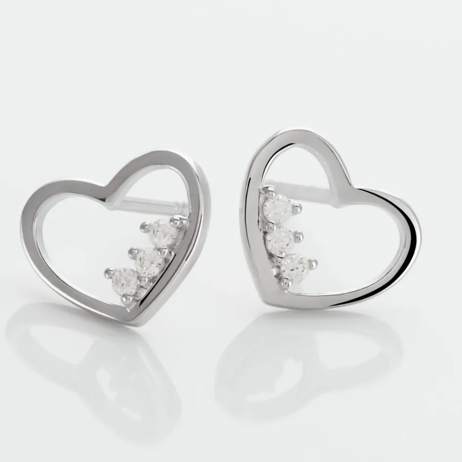 Boucles D’oreilles Puces Argent Blanc 925/1000 C艙urs Sertis Griffes 3 Oxydes De Zirconium