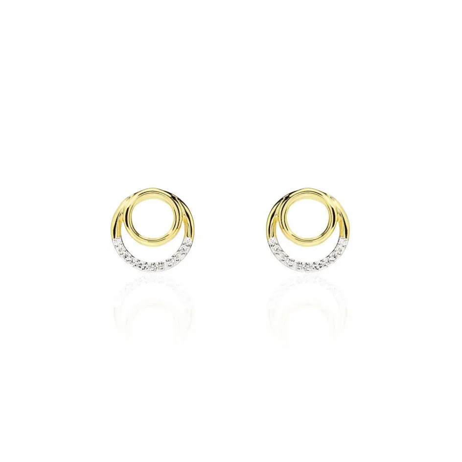Boucles D’oreilles Or Jaune 375/1000 Double Cercle Ajoure Semi Pavage Diamants
