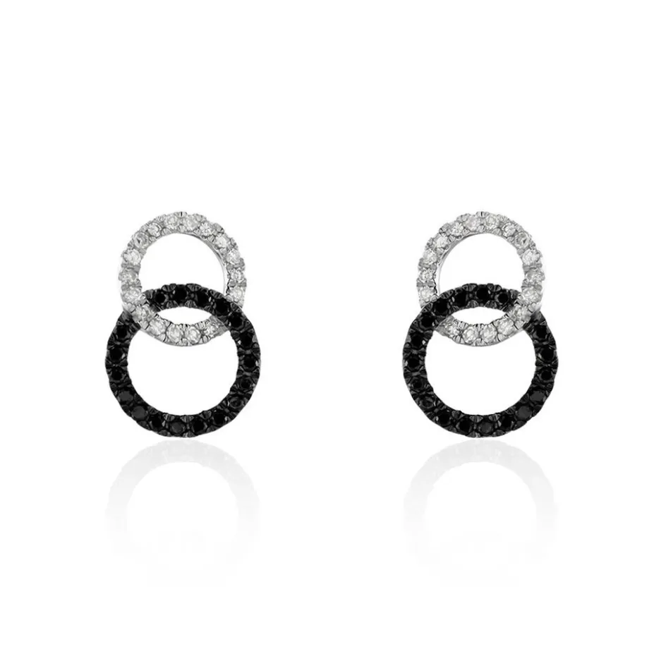 Boucles D’oreilles Puces Or Blanc 375/1000 Toi&moi Cercles Entrelacés Diamants Blancs Et Diamants Noirs