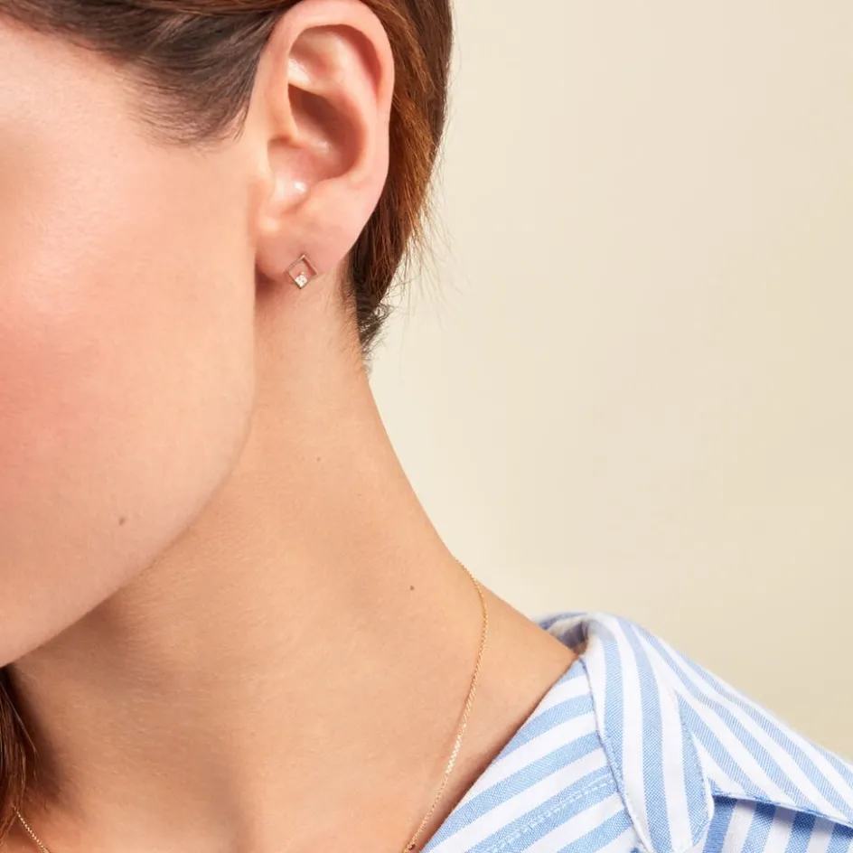 Boucles D’oreille Puces Or Jaune 375/1000 Losanges Ajoures Oxydes De Zirconium Sertis Griffes