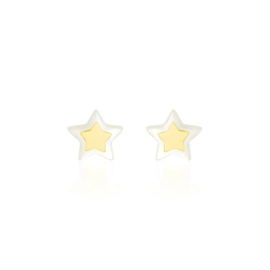 Boucles D’oreilles Or Jaune 375/1000 Puces Formes Etoiles + Motifs Etoiles Nacre Blanche