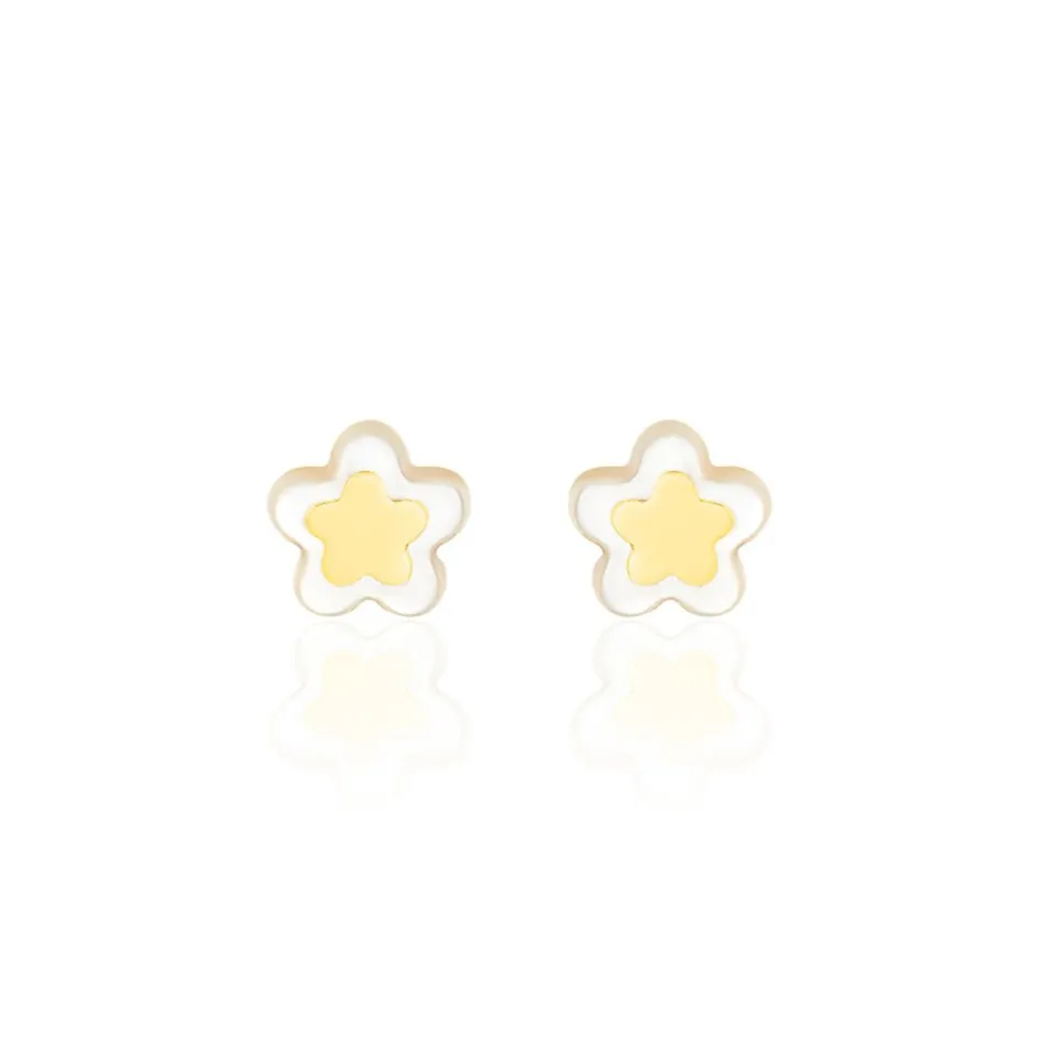 Boucles D’oreilles Or Jaune 375/1000 Puces Formes Fleurs + Motifs Fleurs Nacre Blanche