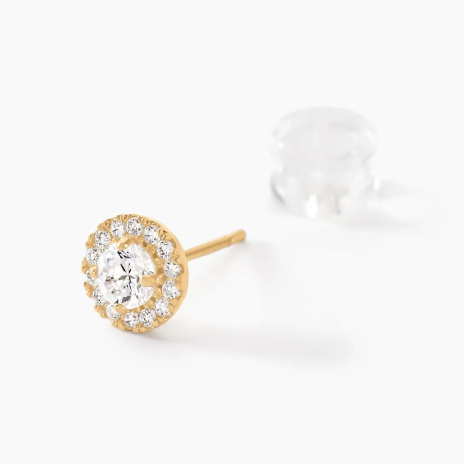 Boucles D’oreilles Or Jaune 375/1000 Puces Rondes Oxydes De Zirconium Et Entourage Oxydes De Zirconium