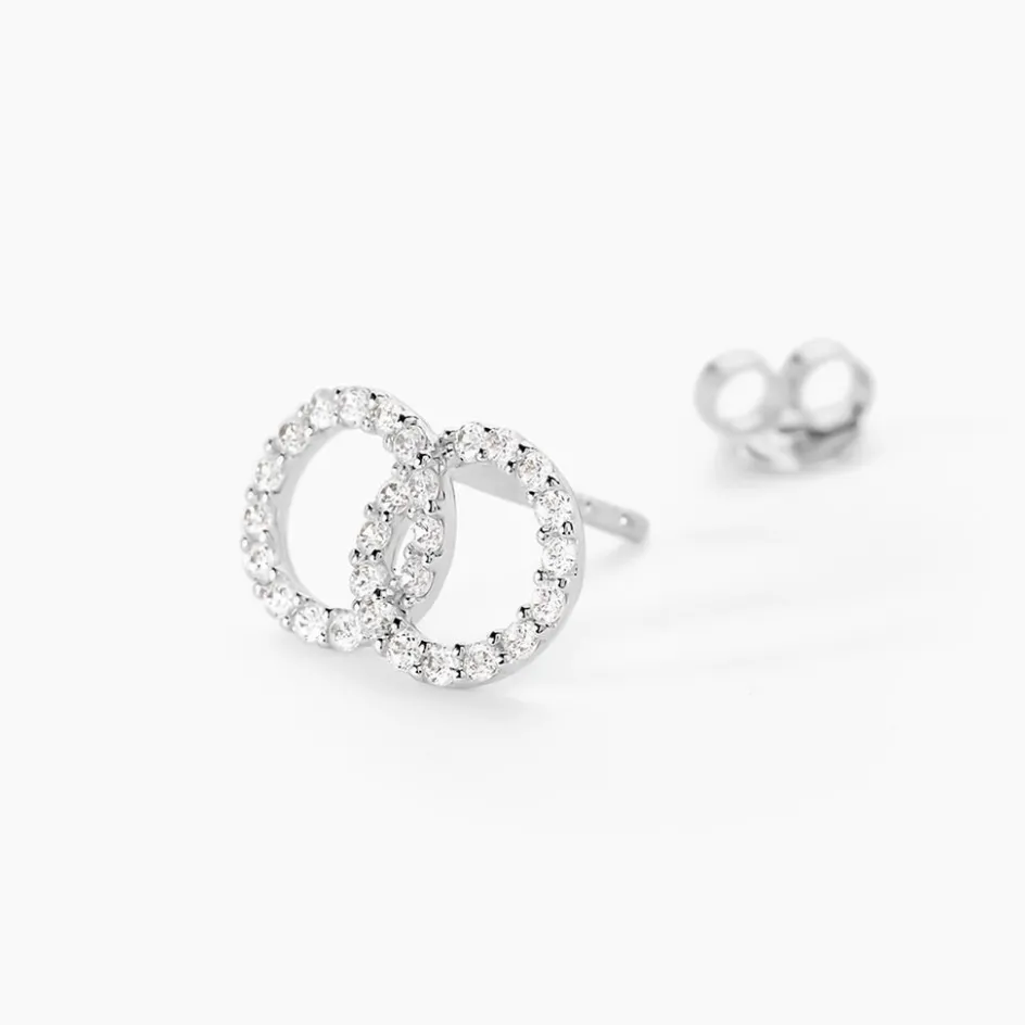 Boucles D’oreilles Puces Argent Blanc 925/1000 Double Cercle Oxydes De Zirconium Serti Griffes