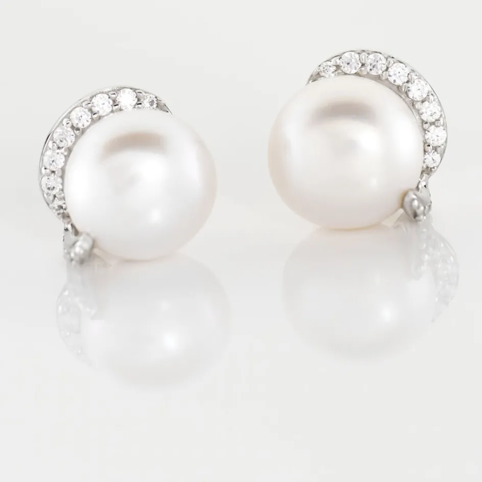 Boucles D’oreilles Or Blanc 375/1000 Puces Perles De Culture 7mm Spirale Oxydes De Zirconium