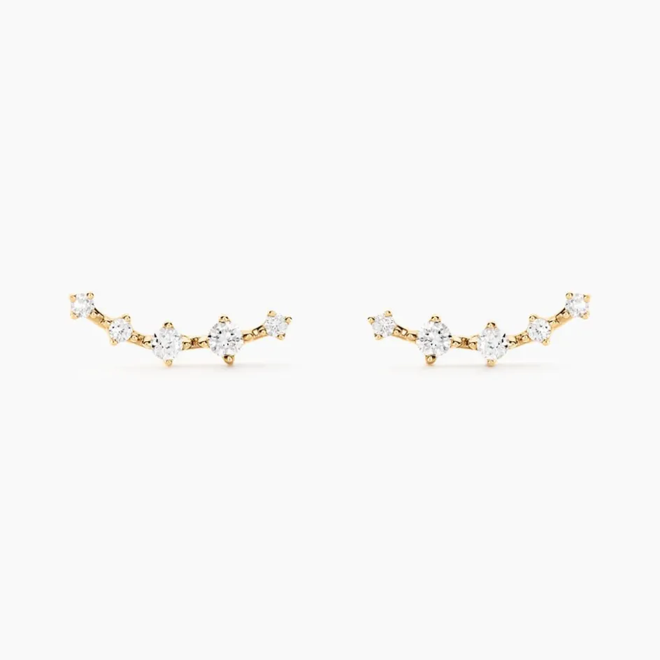 Boucles D’oreilles Puces Or Jaune 375/1000 Barre Incurvee Diamants Synthetiques Ronds 0.07cts Sertis Griffes
