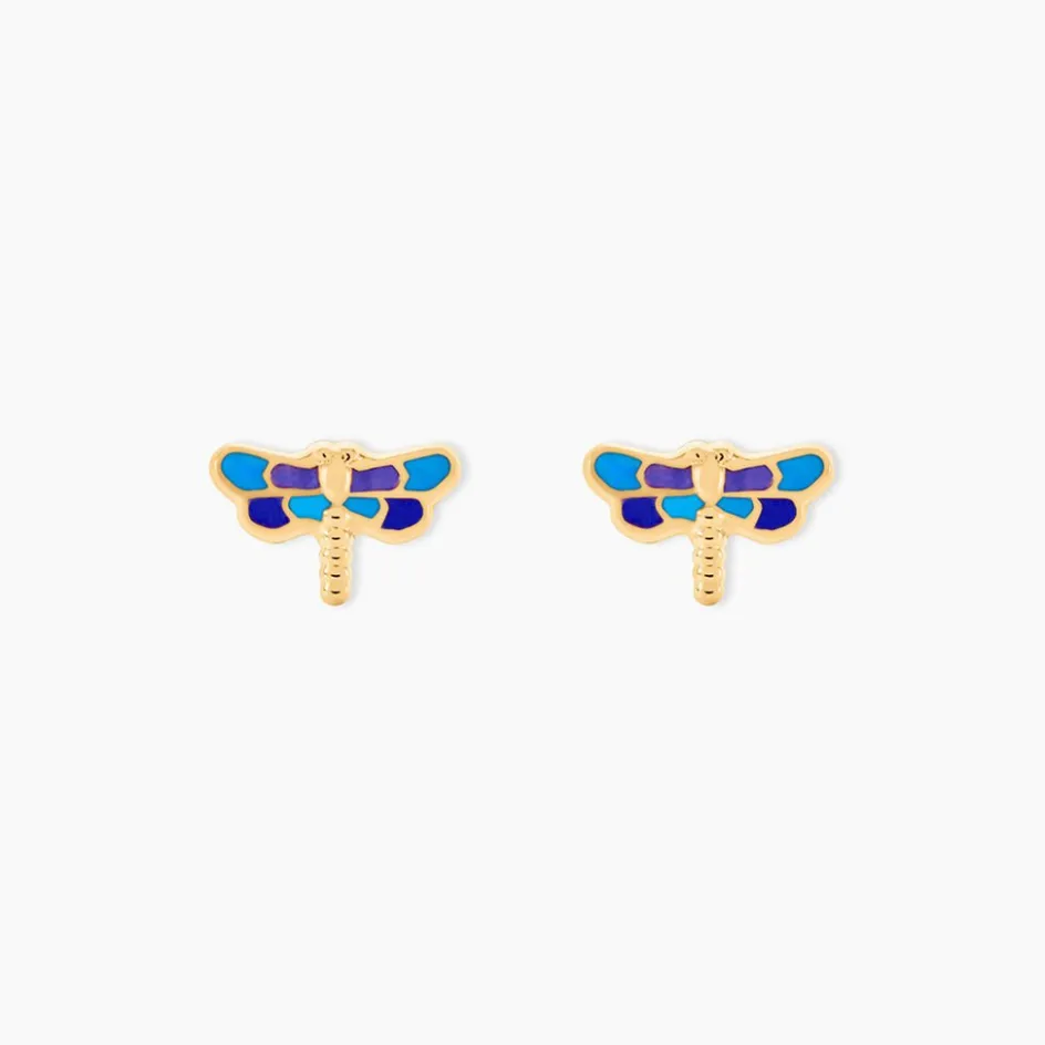 Boucles D’oreilles Puces Or Jaune 750/1000 Libellules Email Multicolore Fermoir A Vis