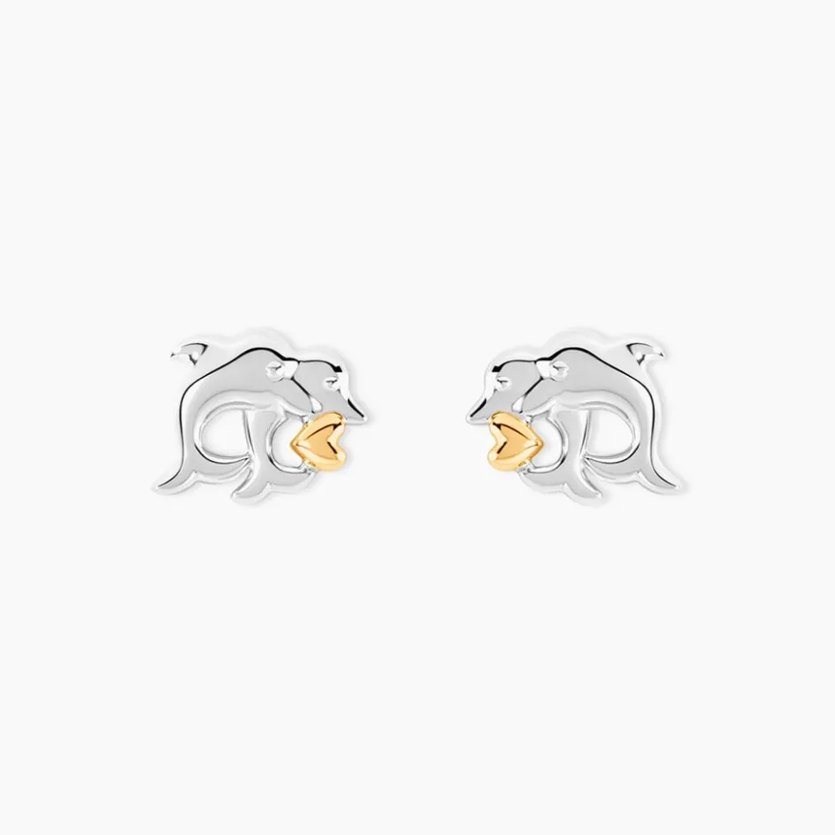 Boucles D’Oreilles Puces Or Jaune 375/1000 Et Argent Blanc 925/1000 Dauphin Et C艙ur