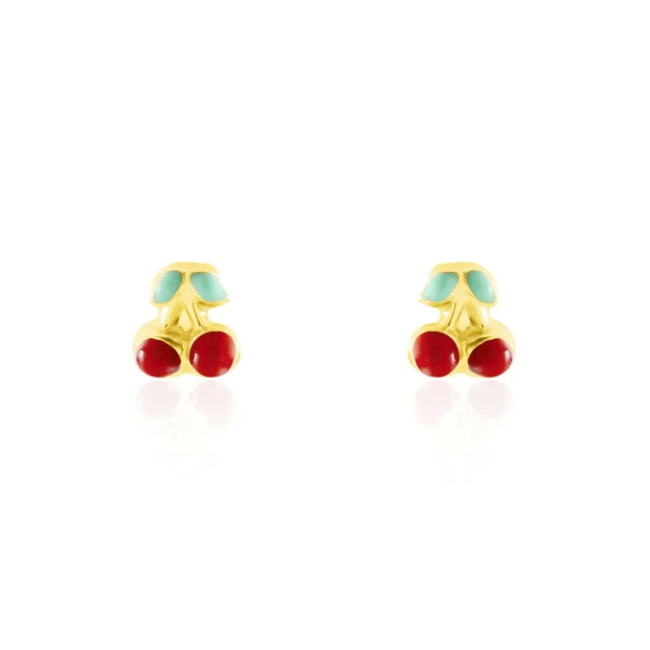 Boucles D’oreilles Puces Or Jaune 375/1000 Cerises Email Rouge Fermoirs Vis