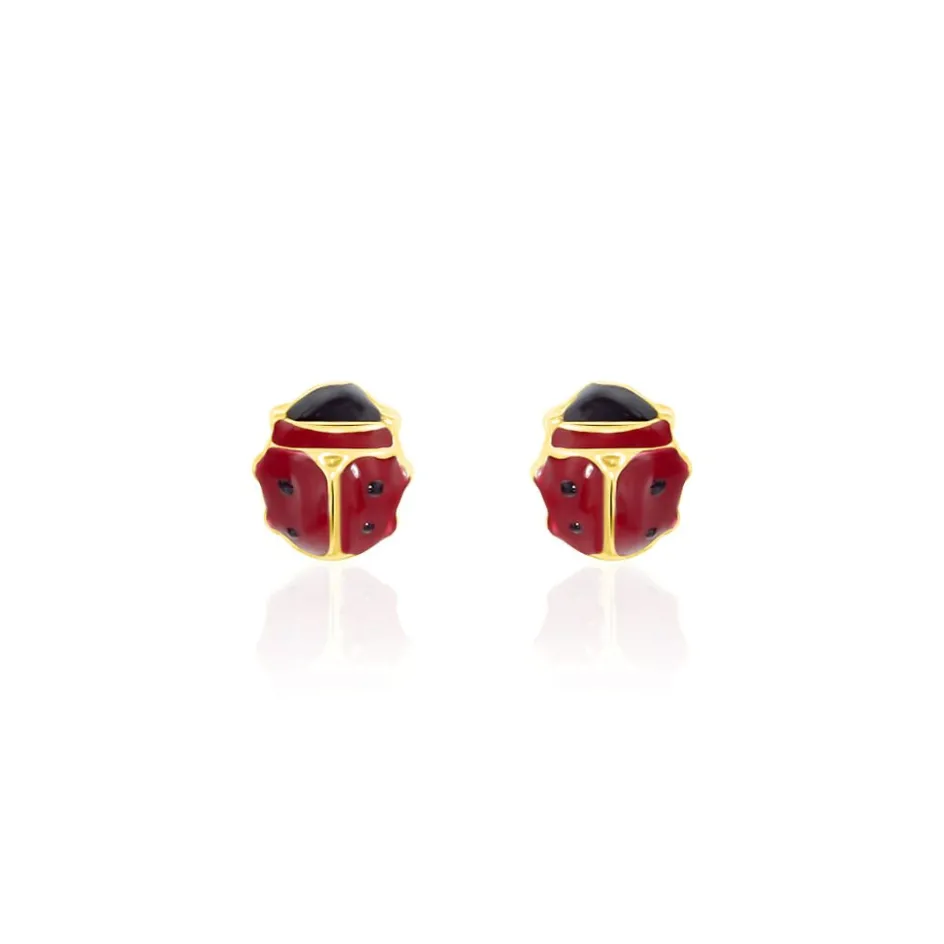 Boucles D’oreilles Puces Or Jaune 375/1000 Coccinelles Email Rouge Fermoirs Vis