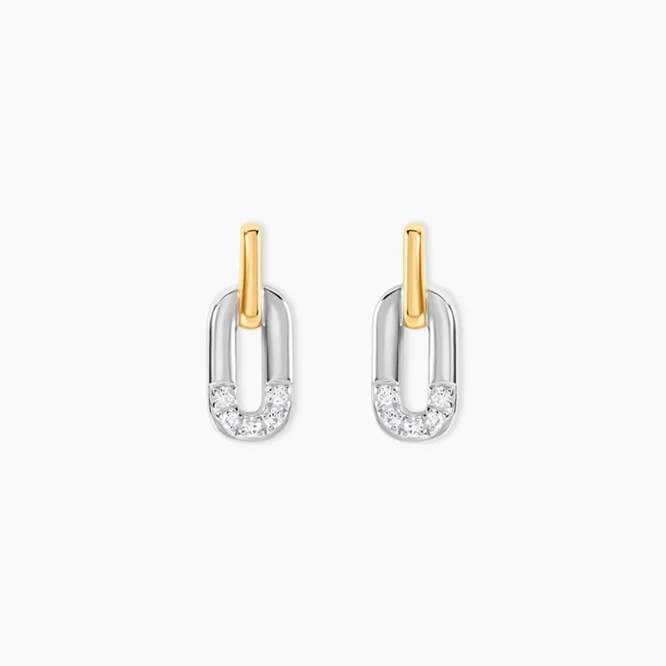 Boucles D’Oreilles Puces Or Jaune 375/1000 Et Argent Blanc 925/1000 Ovale Ajoure Oxydes De Zirconium Blancs