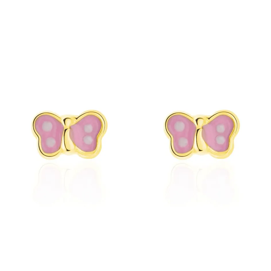Boucles D’oreilles Or Jaune 375/1000 Papillon Email Rose