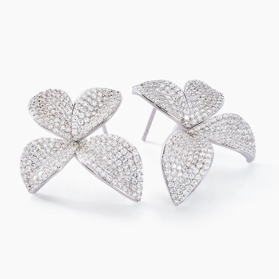 Boucles D’oreilles Puces Argent Blanc 925/1000 Fleurs Pavage Oxydes De Zirconium