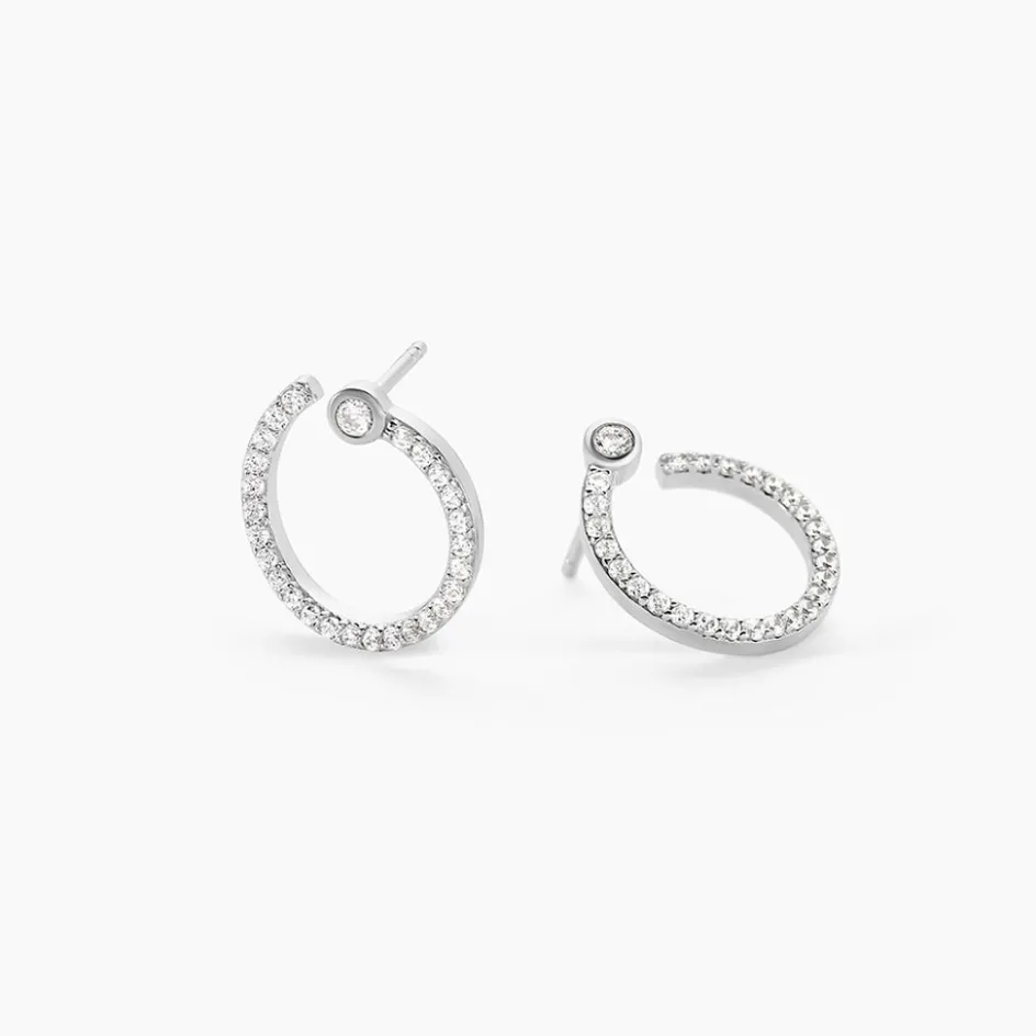 Boucles D’oreilles Puces Argent Blanc 925/1000 Cercles Oxyde De Zirconium Serti Clos Et Pavage