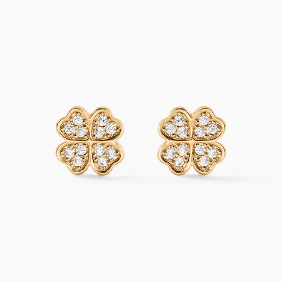 Boucles D’oreilles Puces Plaqué Or Jaune Trèfles Pavage Oxydes De Zirconium