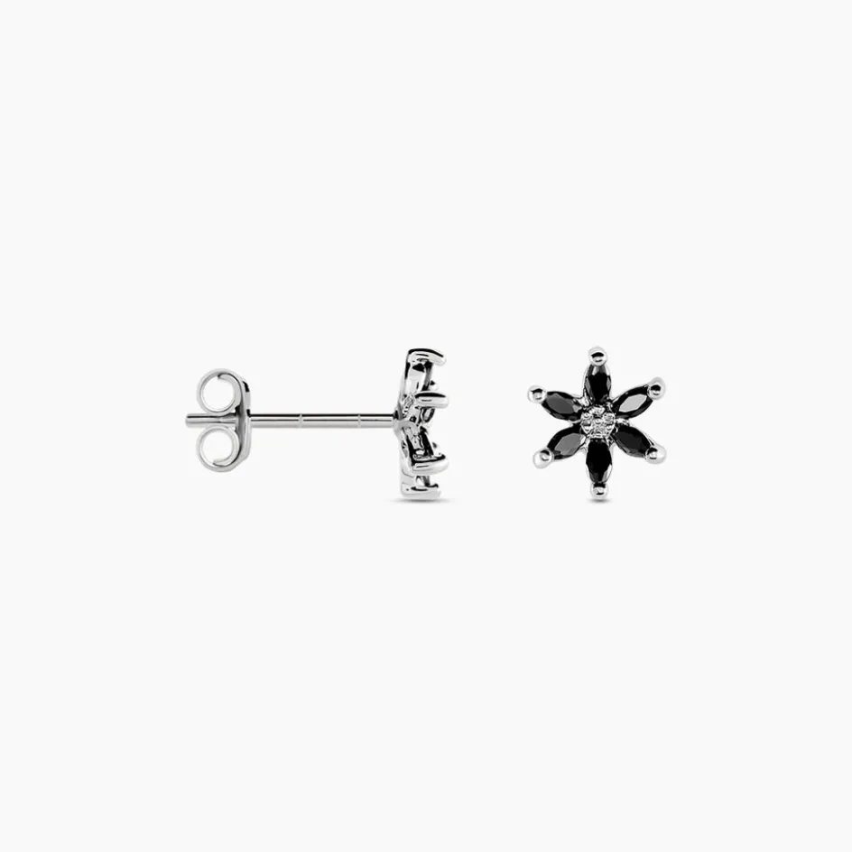 Boucles D’oreilles Puces Argent Blanc 925/1000 Fleurs Oxydes De Zirconium Noirs