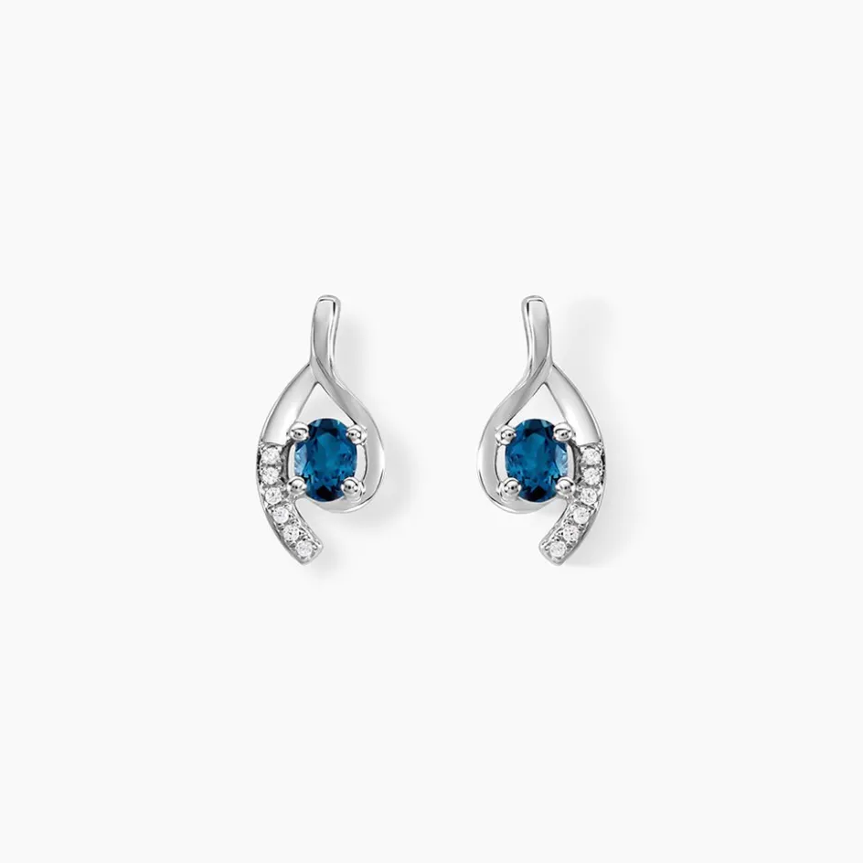 Boucles D’oreilles Puces Or Blanc 375/1000 Formes Vrillées Topazes London Blue Et Oxydes De Zirconium