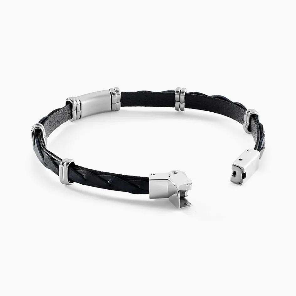 Bracelet Acier Inoxydable Blanc Cuir De Vache Noir Et Bleu Tressé 21cm
